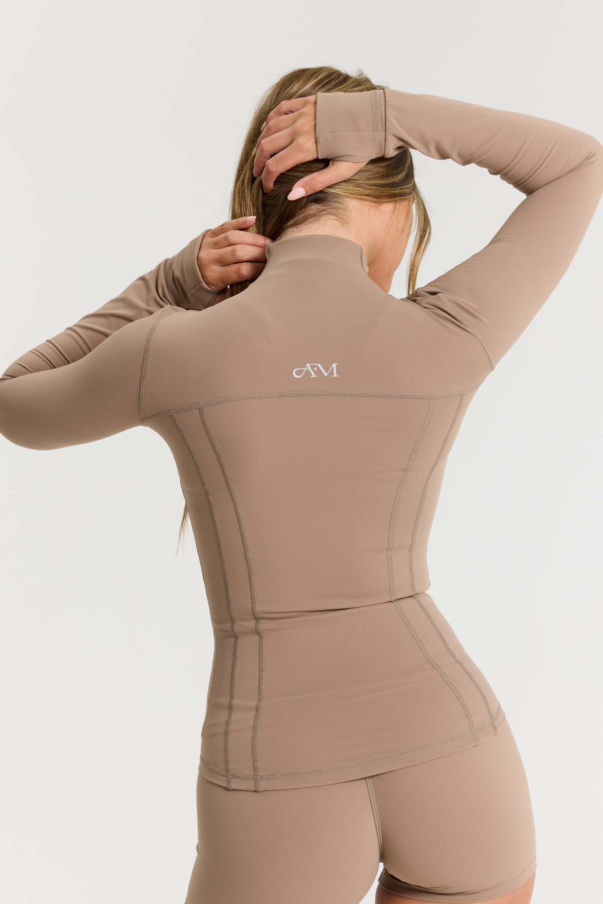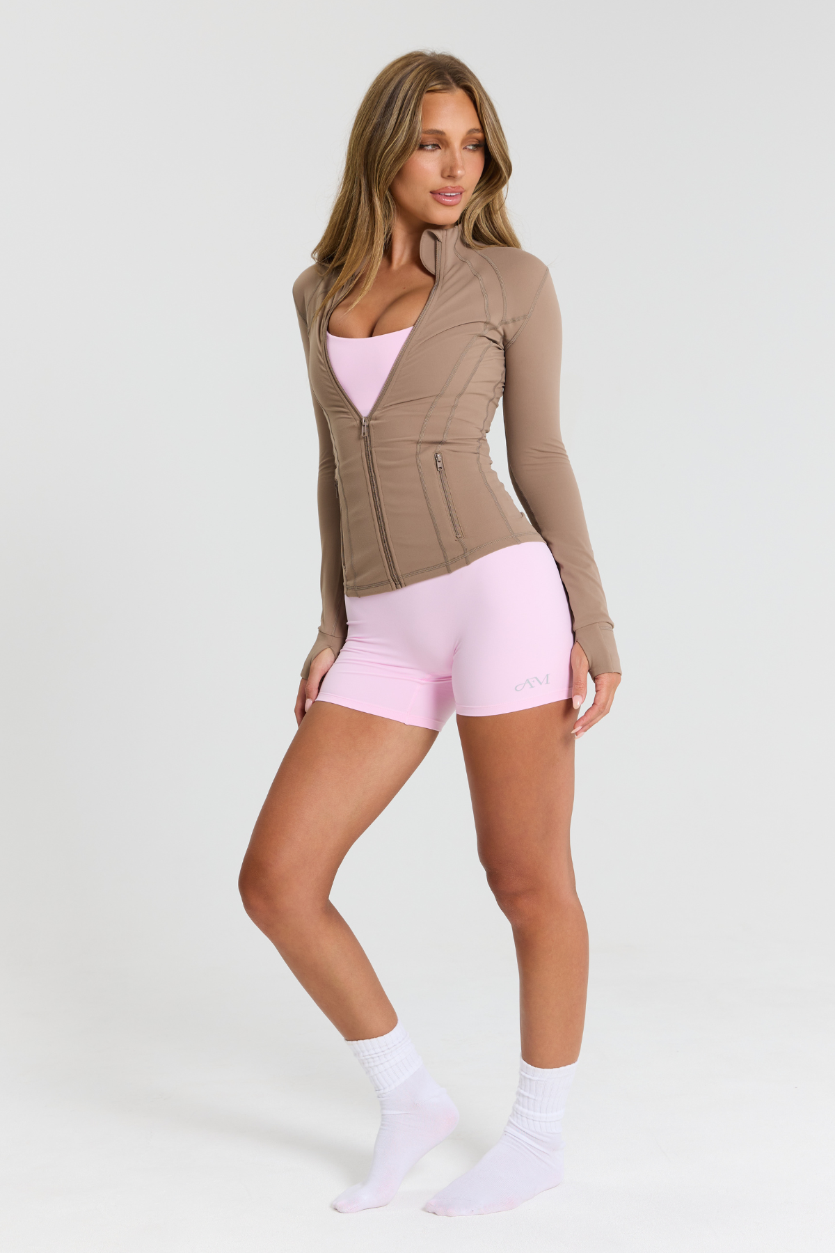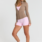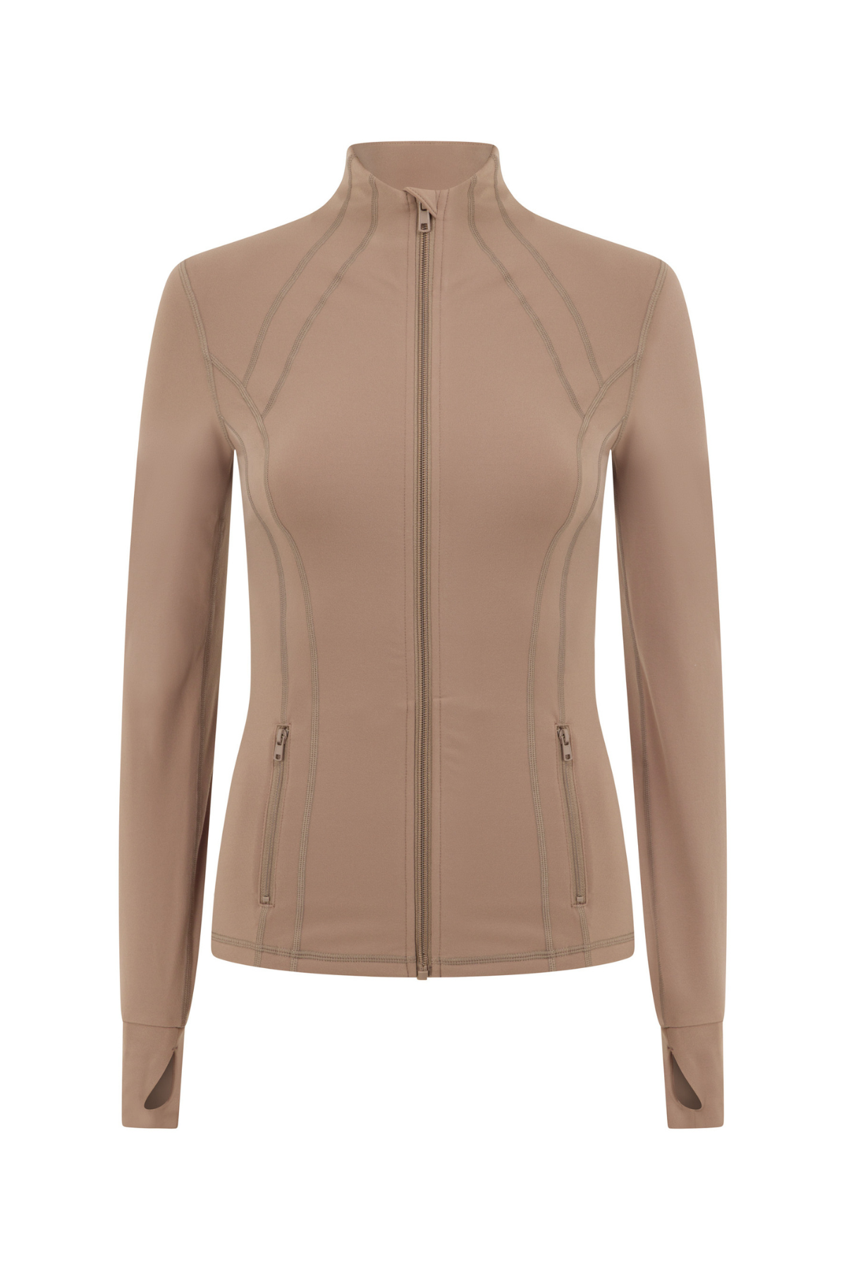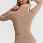 Our Zip Jacket in Latte is the form-fitting, sculpting layer you need in your active collection. This full-length jacket features zip pockets, thumbholes and an inner pocket for your phone.