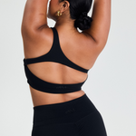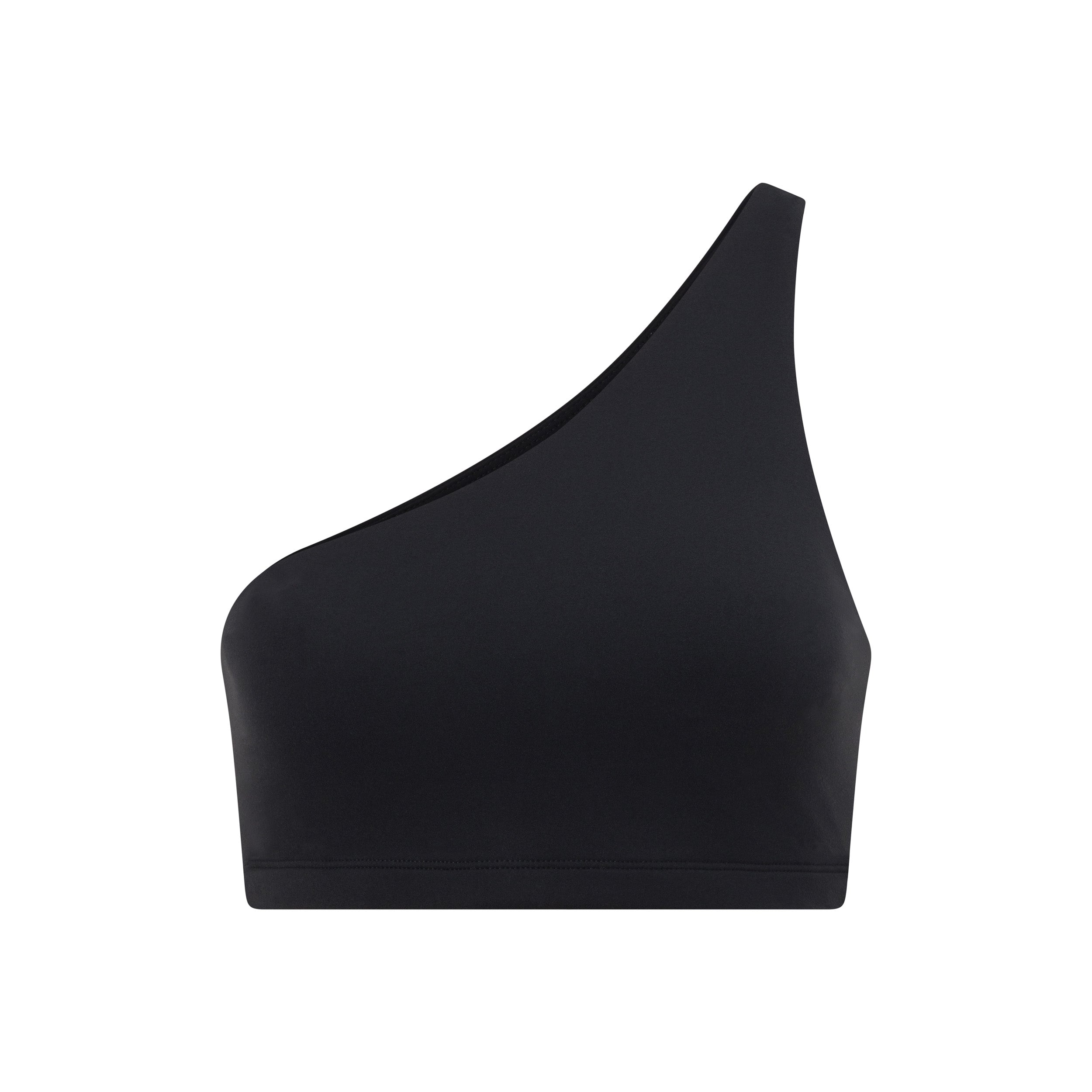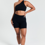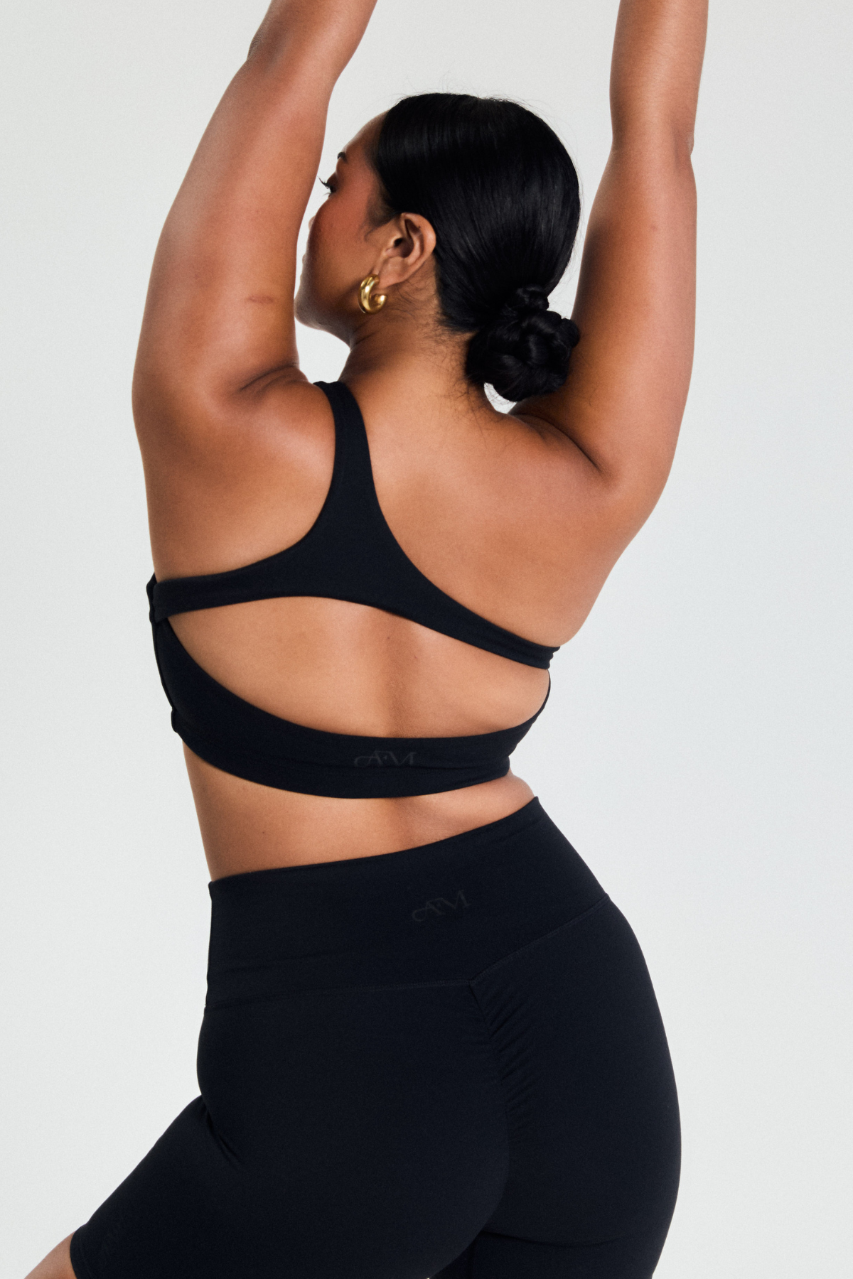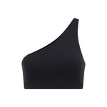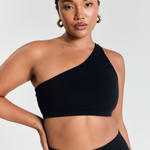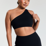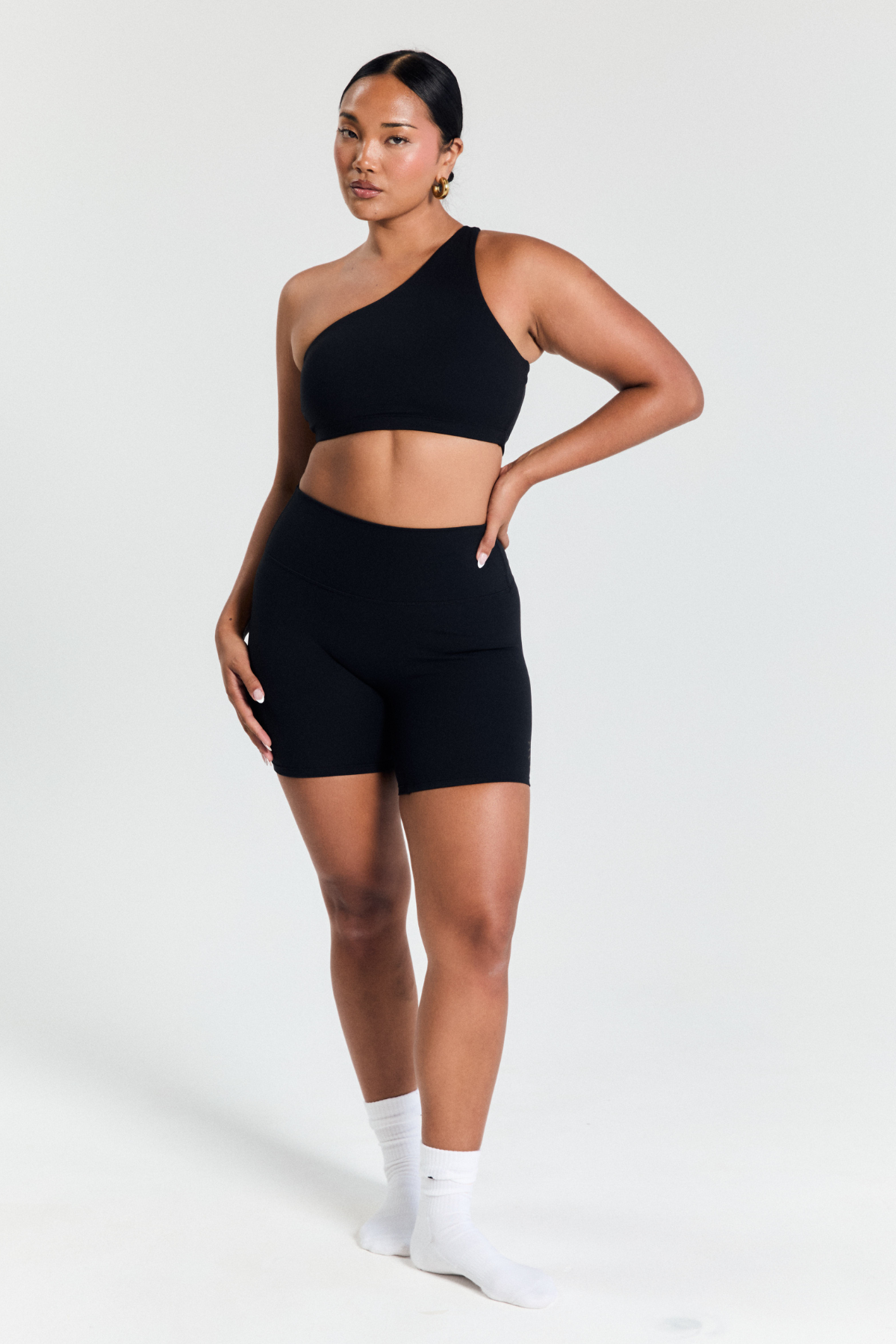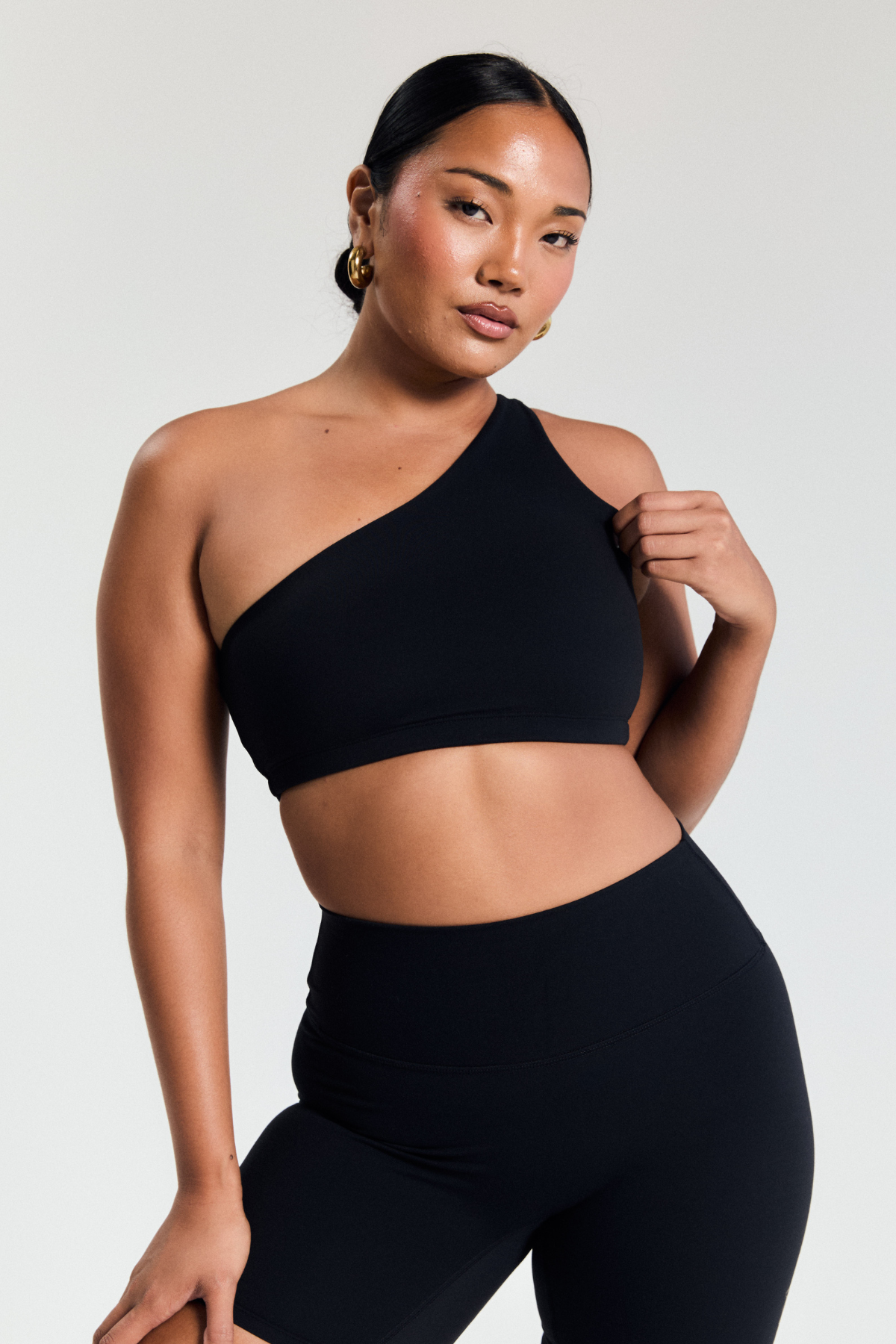 One of our newer styles of crop - a unique asymmetrical crop in black. Made from our buttery soft activewear fabric, designed for movement.
