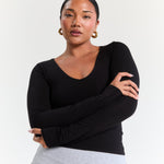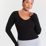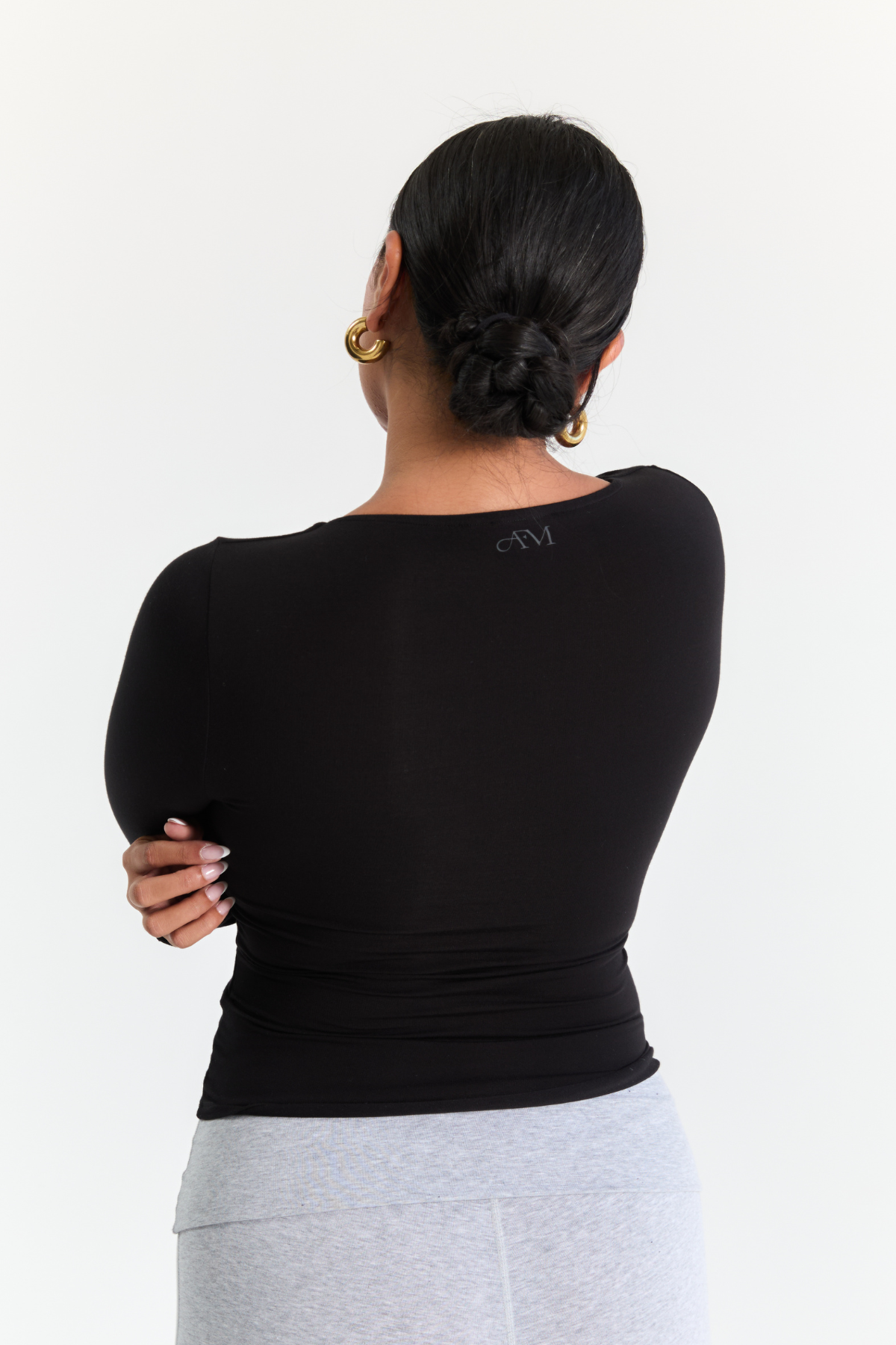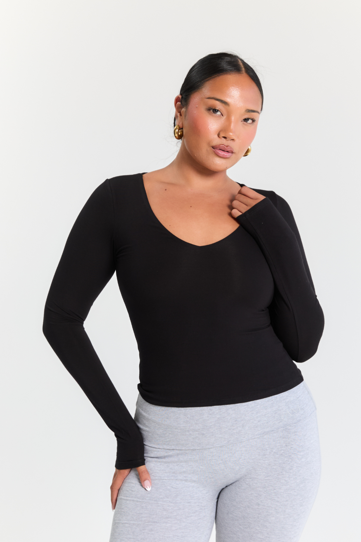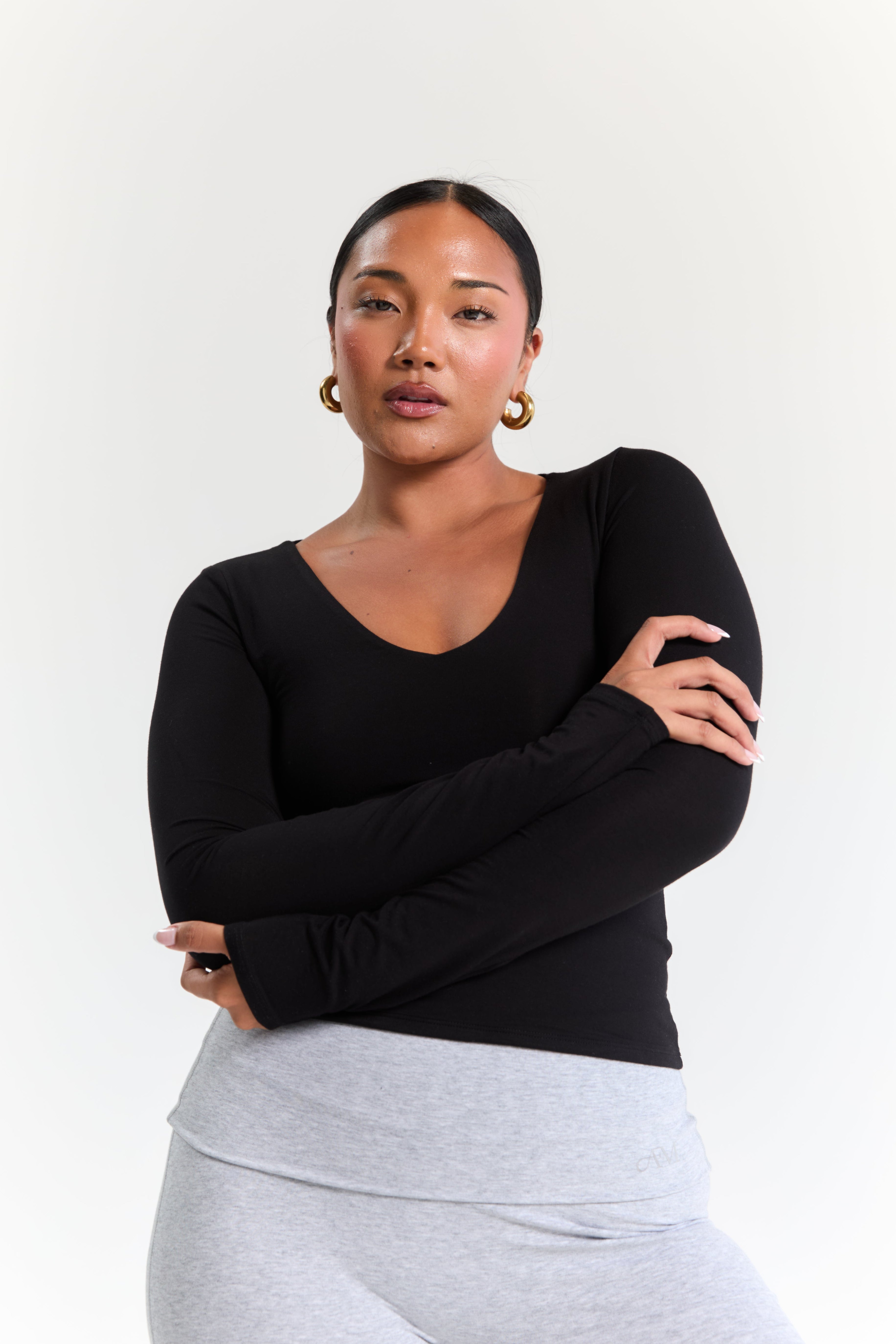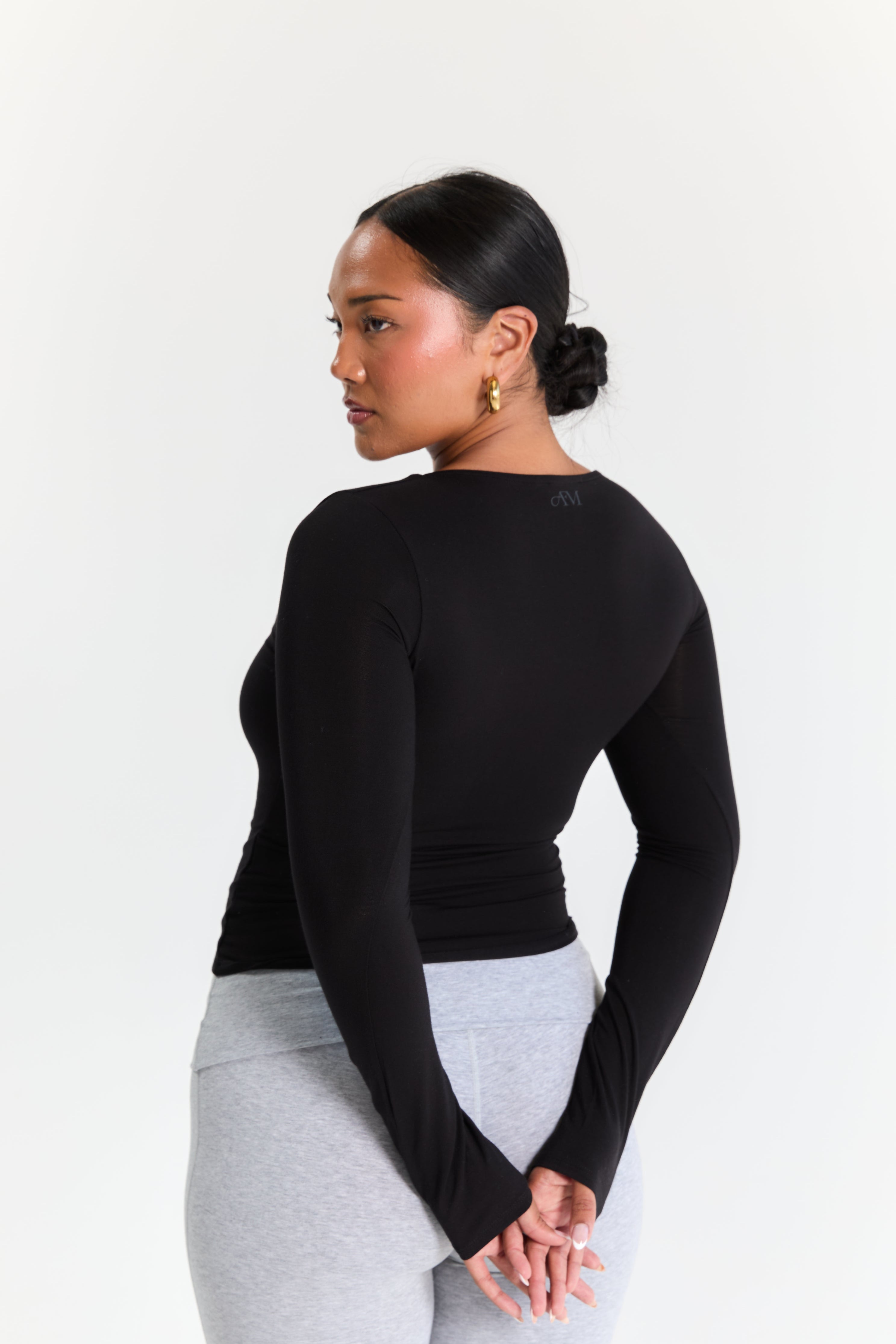Our core long sleeve in Black has been crafted using a breathable, cotton fabrication with a double-lined front layer for a flattering fit. This style doesn't compromise on comfort - a trans-seasonal staple to add to your core collection.