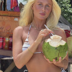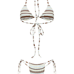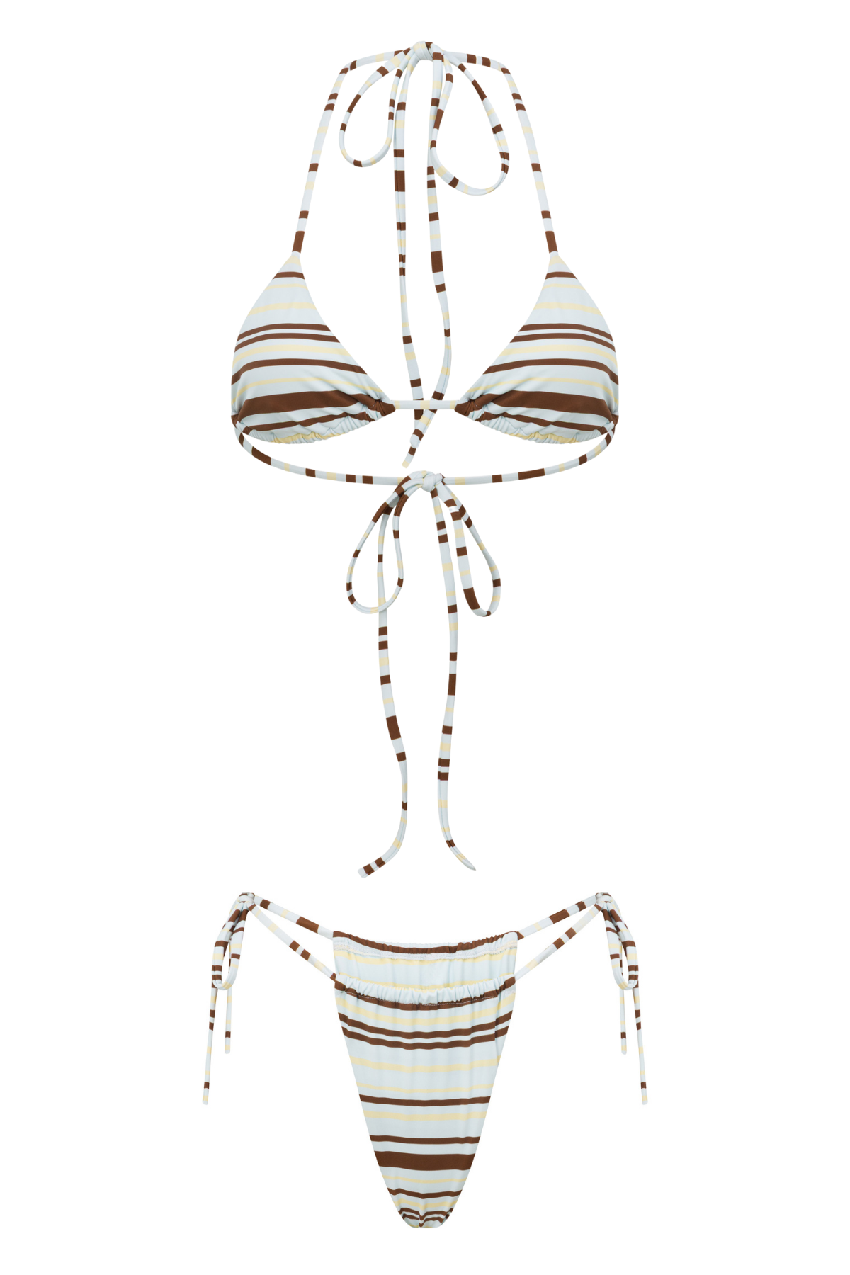 The Kora bikini features a Blue base with Lemon and Brown stripes - a print made for your 2026 summer.