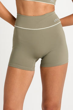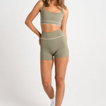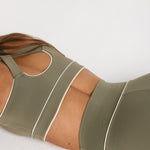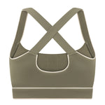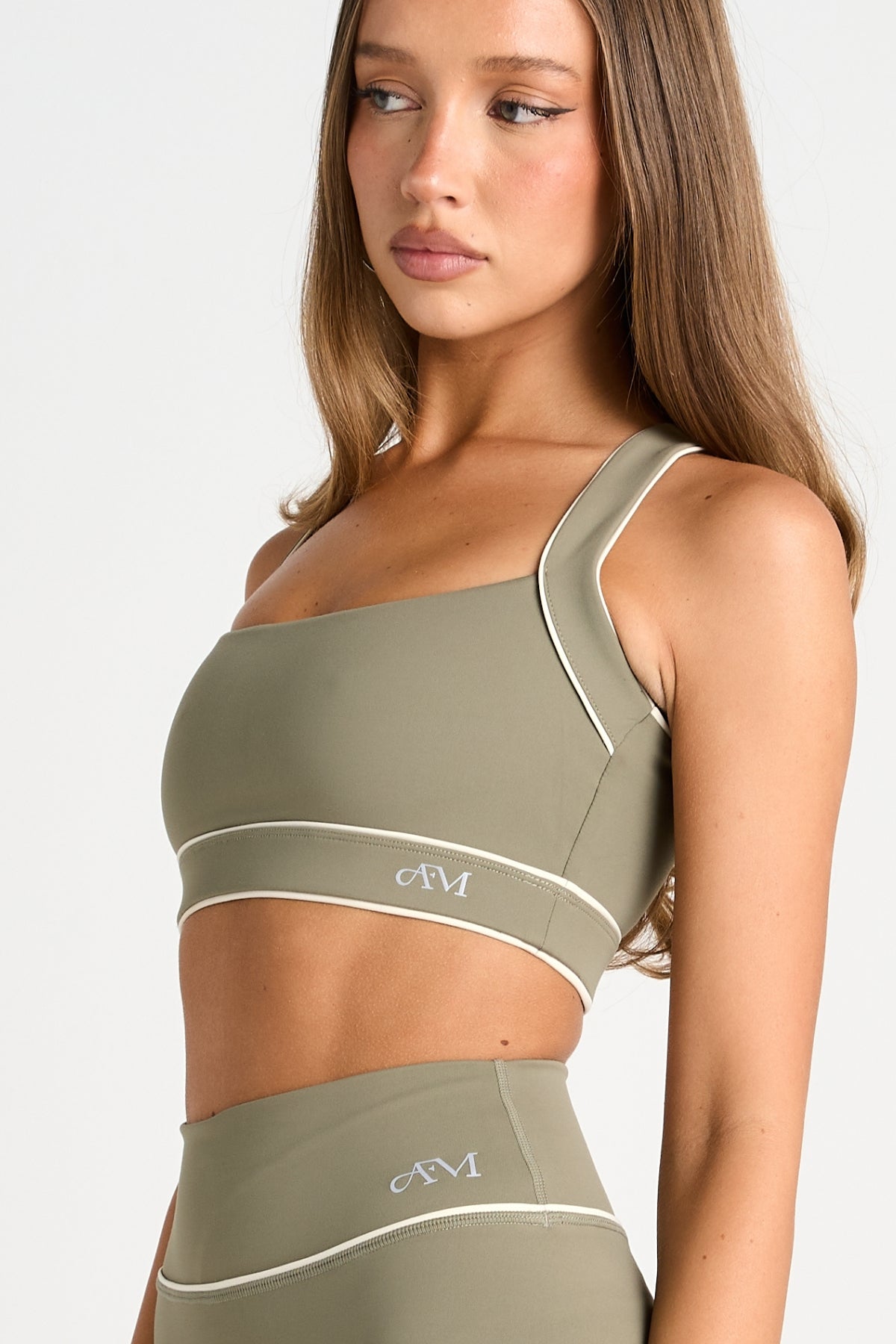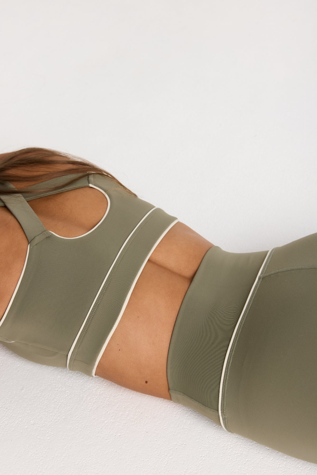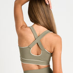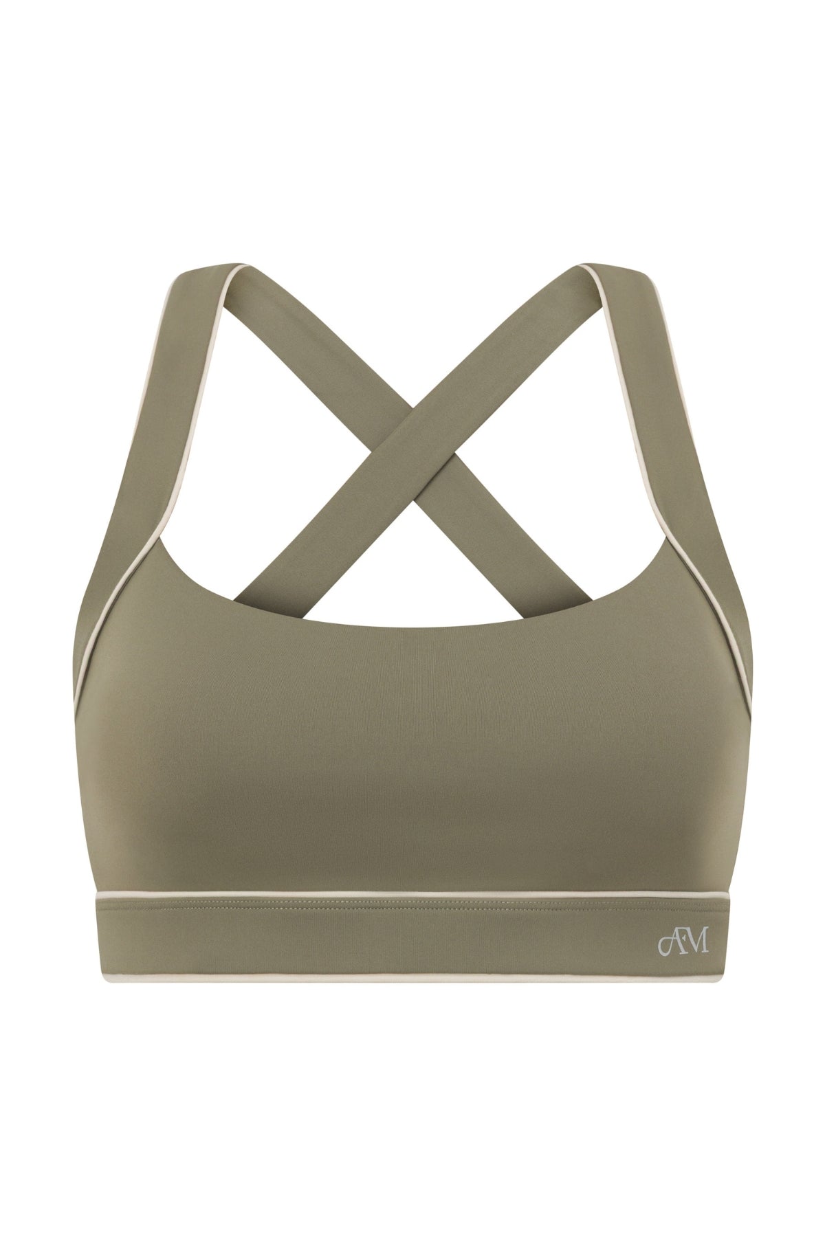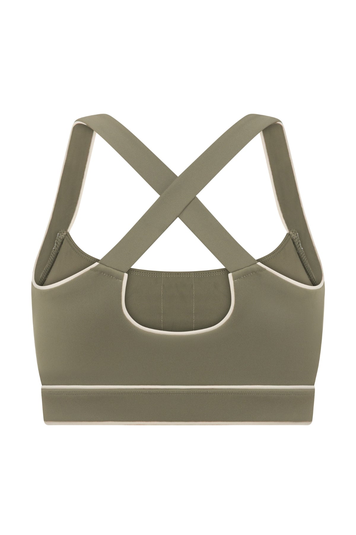 This new style, medium-support crop features a flattering cross-over back and light contrast piping in a new colourway - Olive.