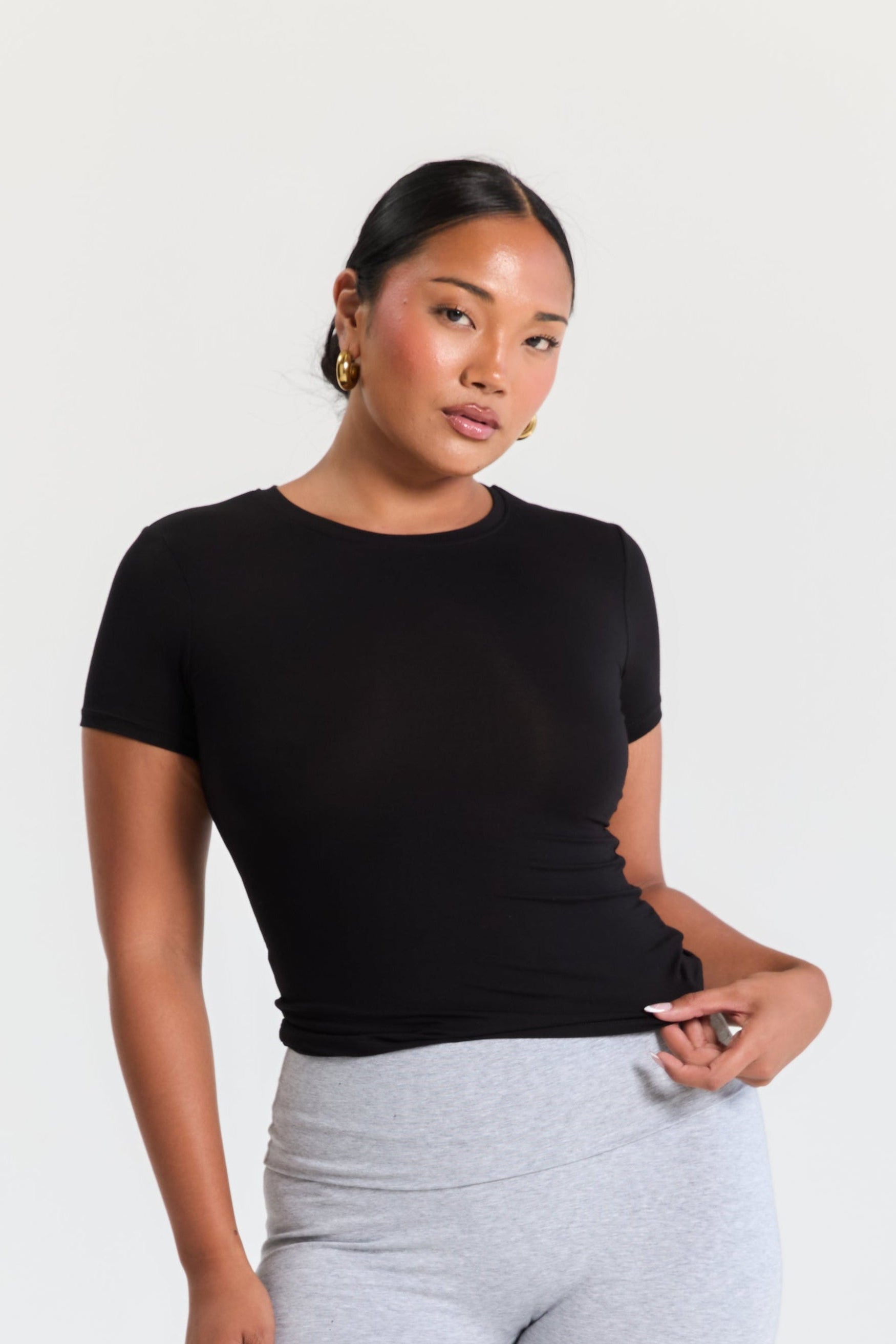 Our classic Baby Tee in Black is a wardrobe staple. This tee is made from a super-soft, stretchy modal cotton fabrication that flatters in all the right places. Our Baby Tee features a round neck and short sleeves with a subtle AFM logo detail on the back.