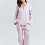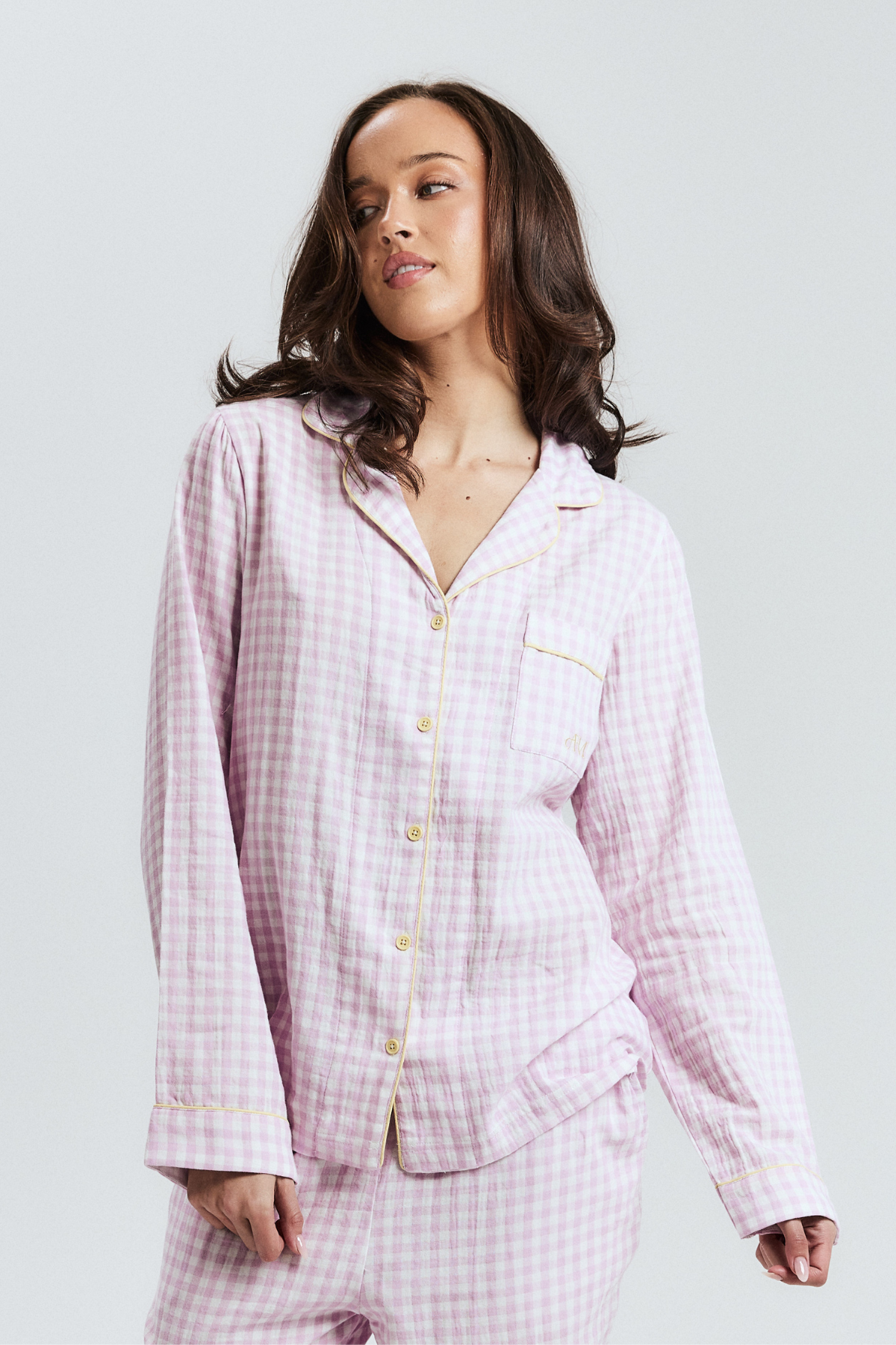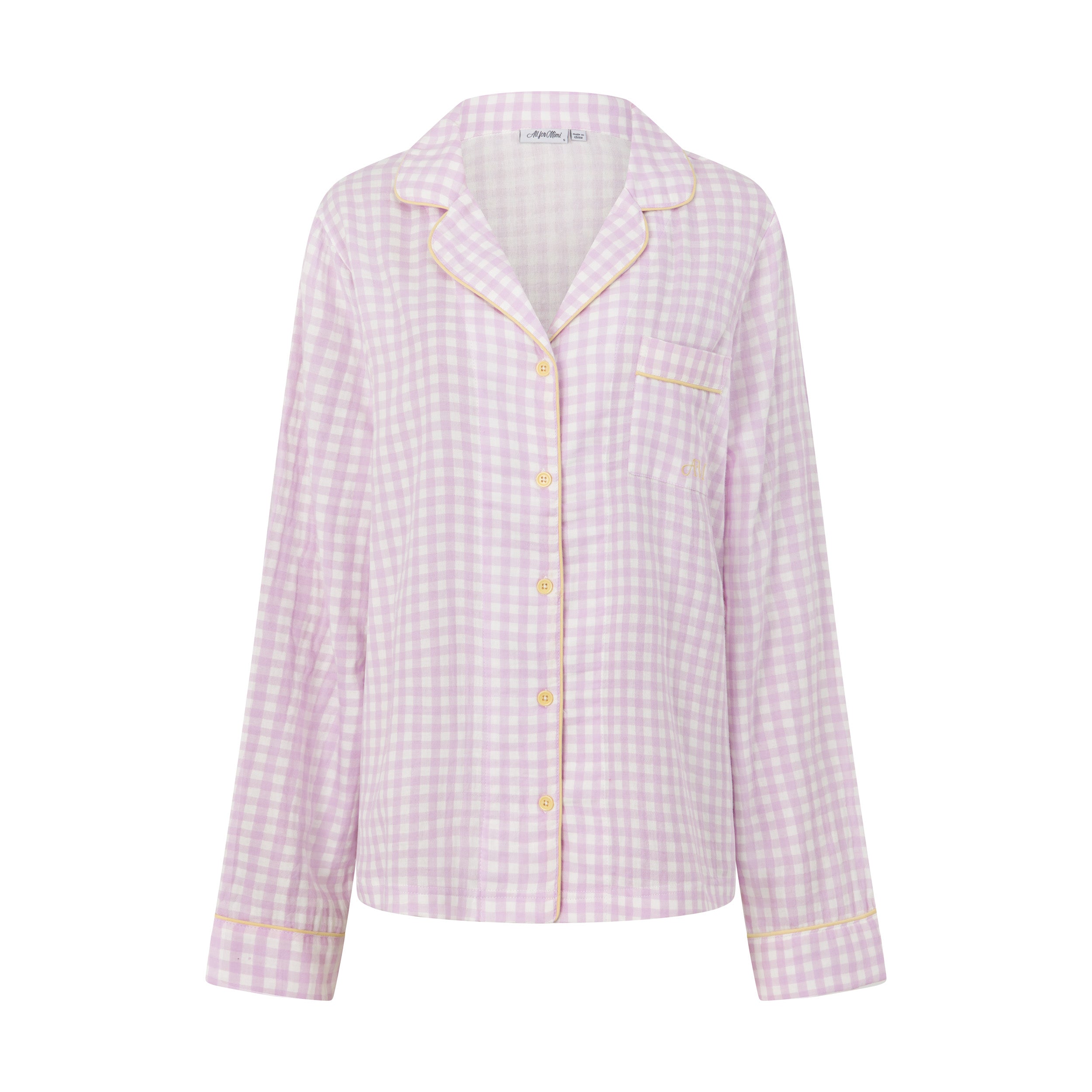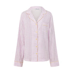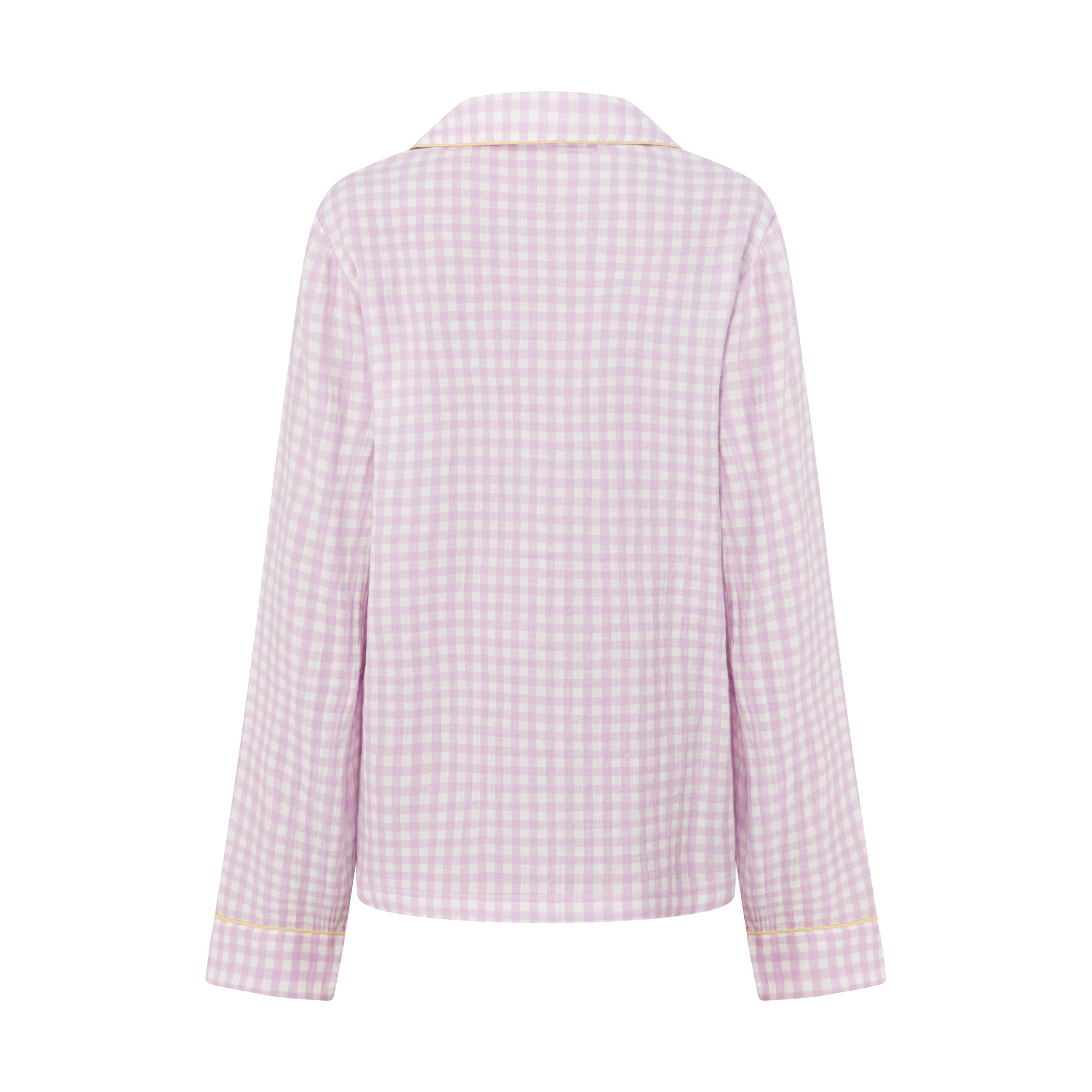 The pyjamas of your dreams - our best selling gingham PJs in the reverse colourway - purple gingham with yellow details.