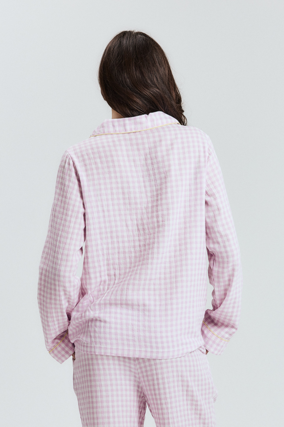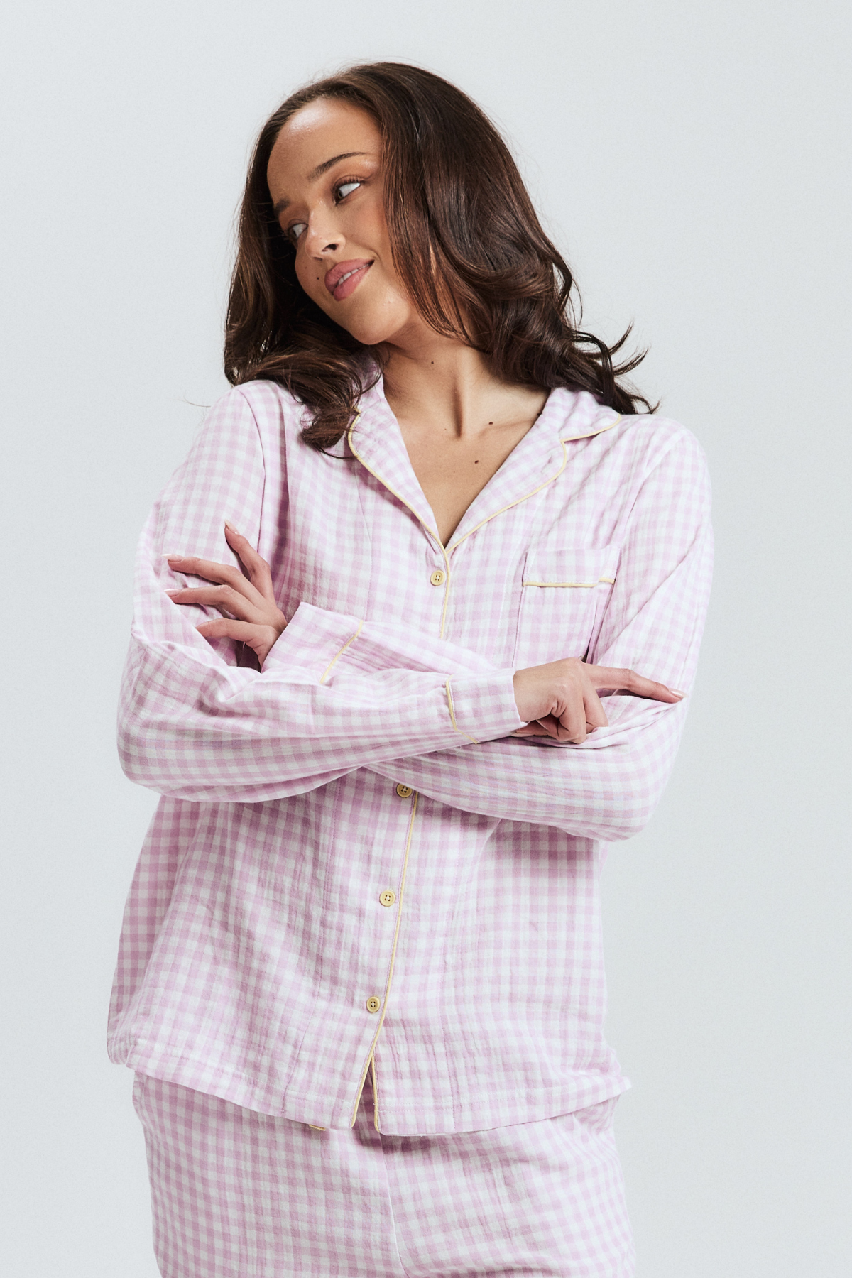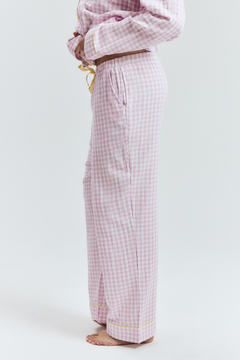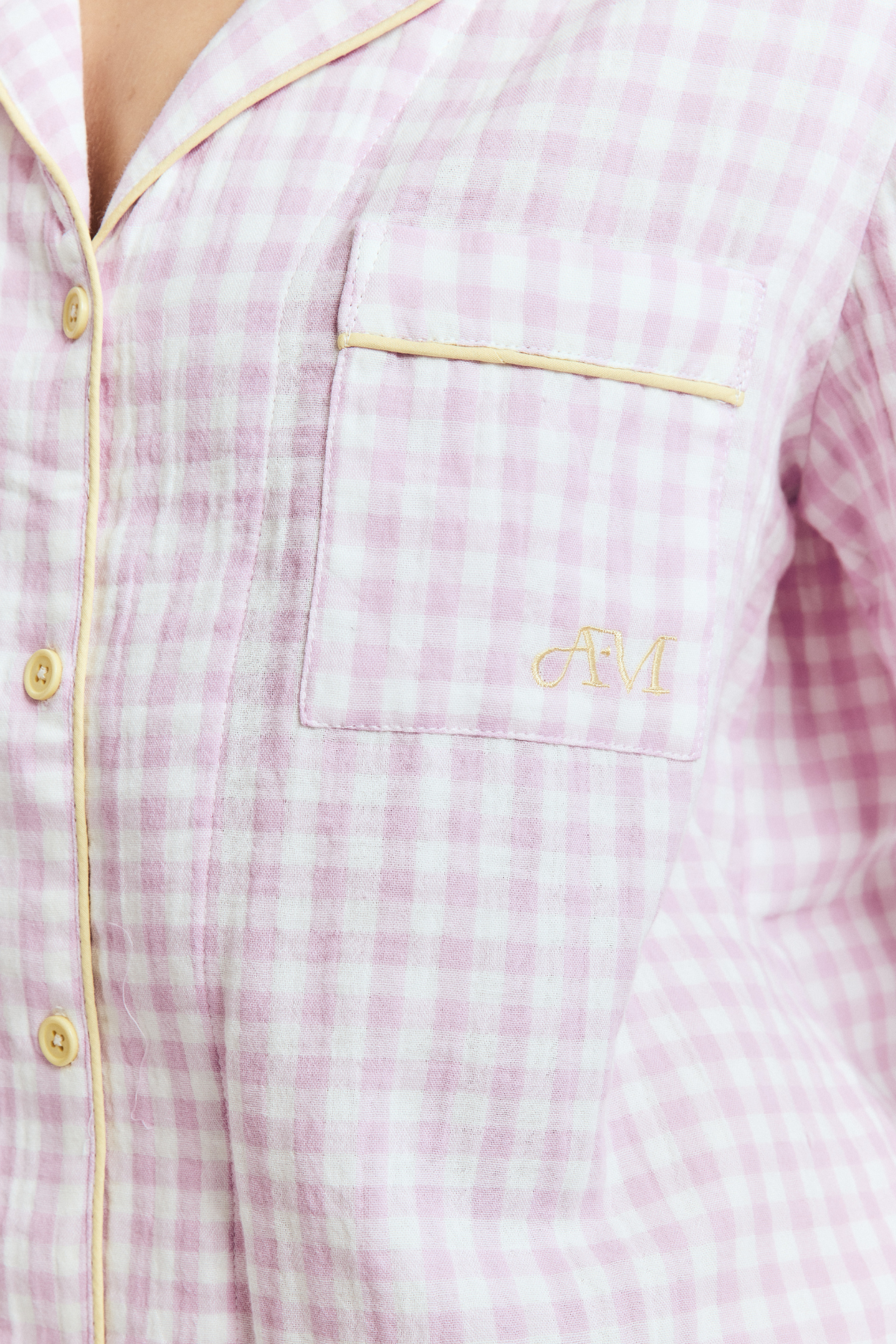 The pyjamas of your dreams - our best selling gingham PJs in the reverse colourway - purple gingham with yellow details.