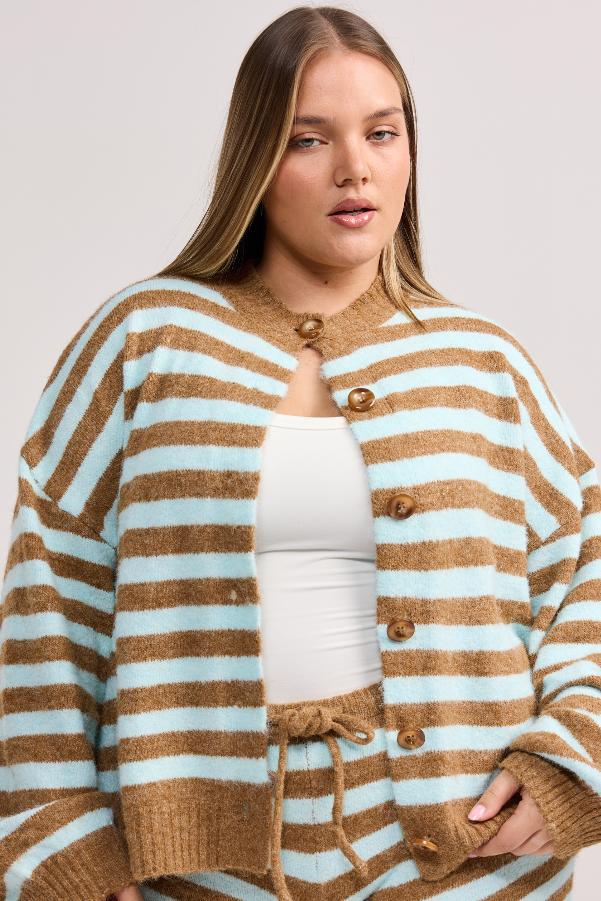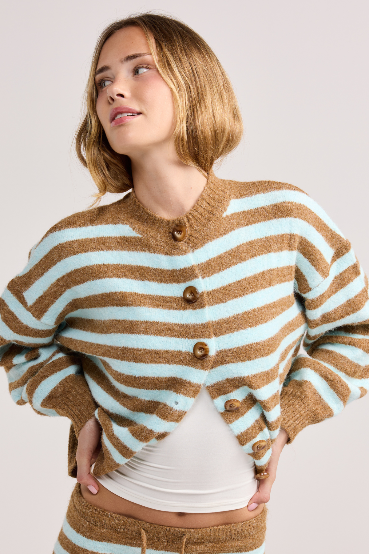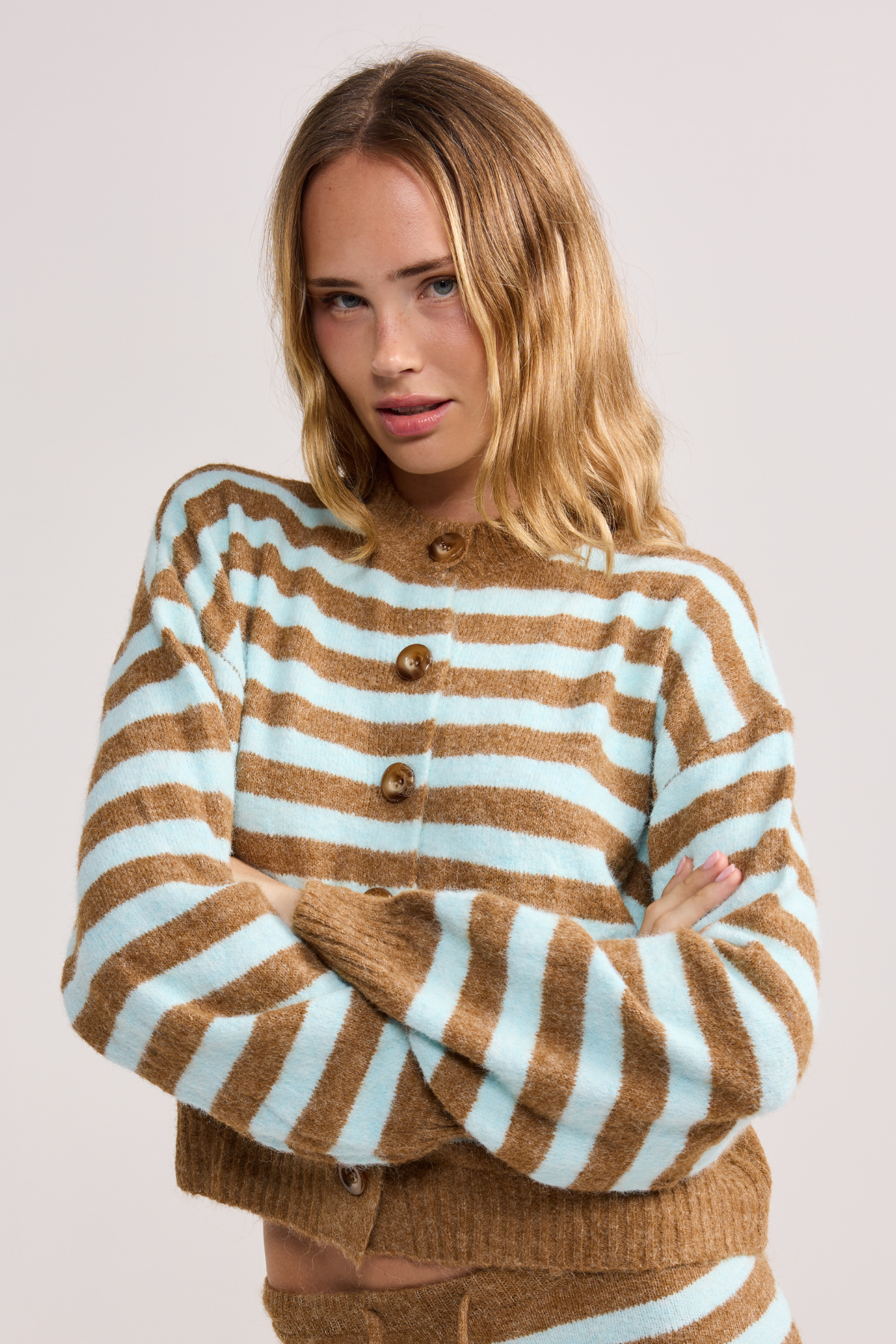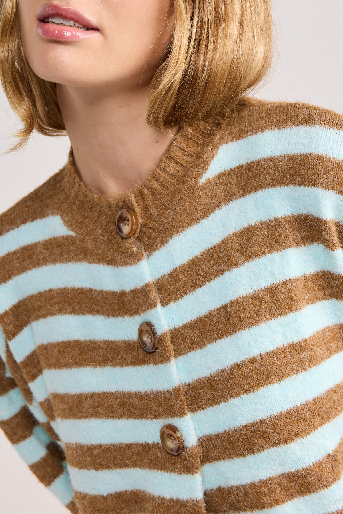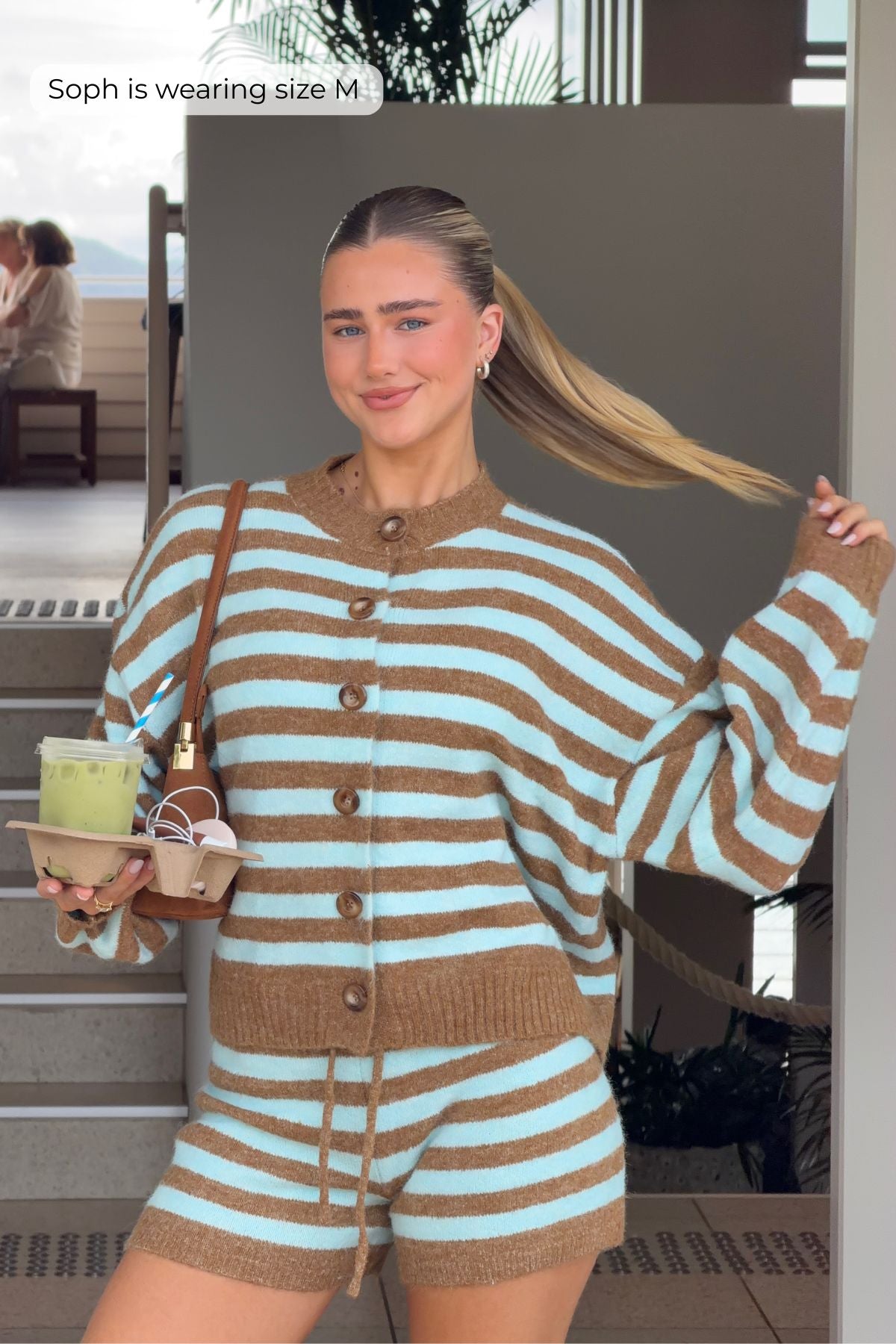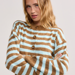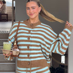 The Romi Button Up Knit features a bold Blue and Brown stripe, ribbed cuffs, waistband and neckline with 6 tortoiseshell buttons down the front.