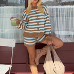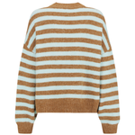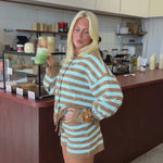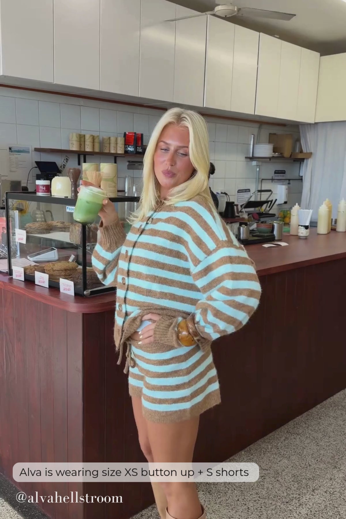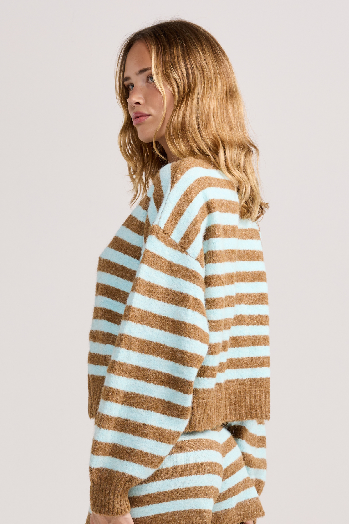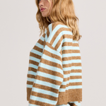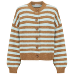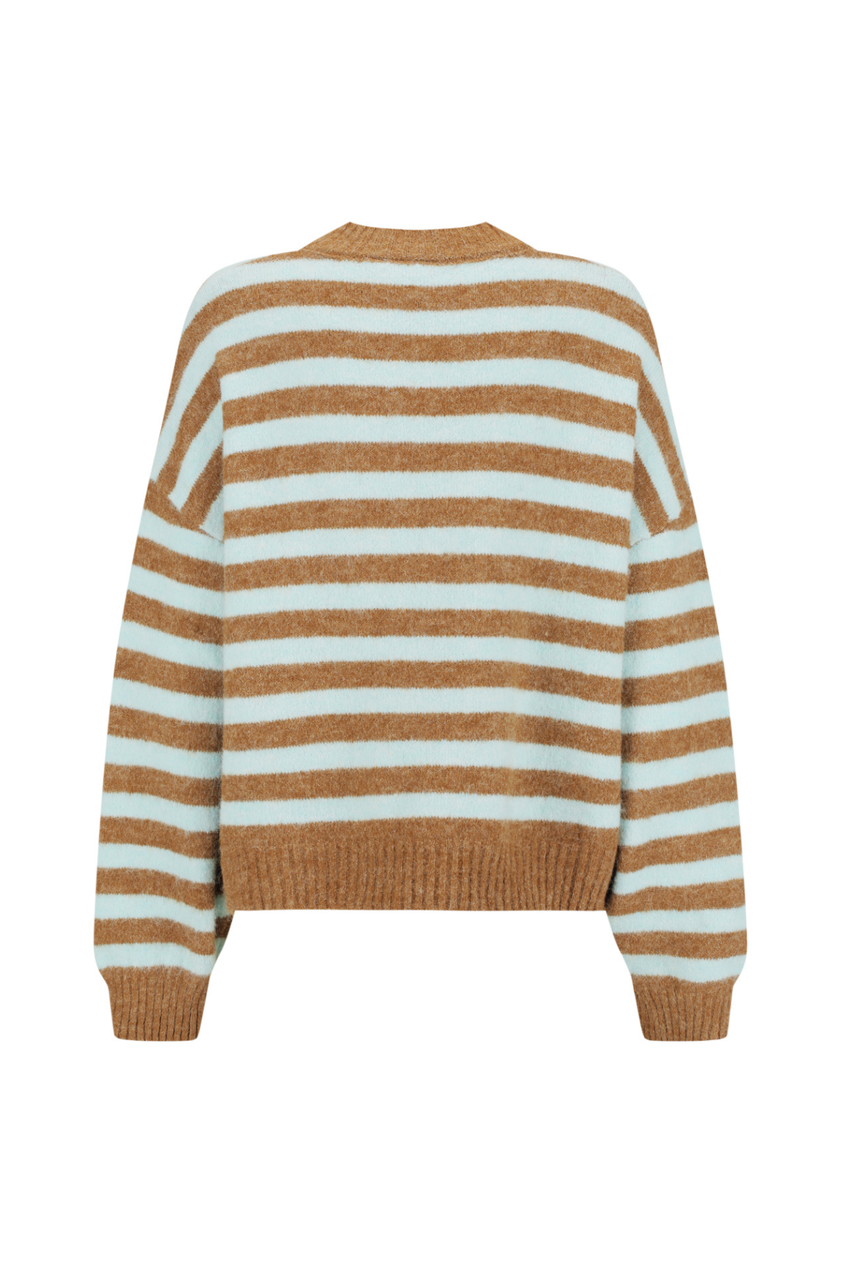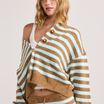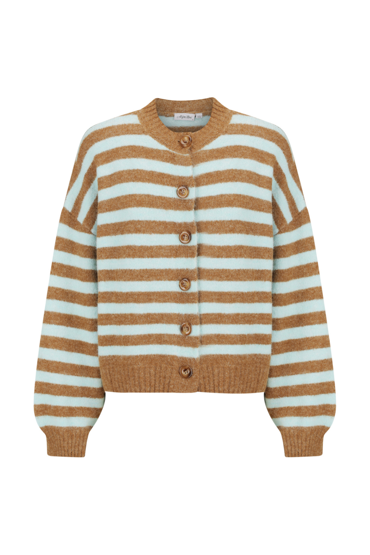The Romi Button Up Knit features a bold Blue and Brown stripe, ribbed cuffs, waistband and neckline with 6 tortoiseshell buttons down the front.